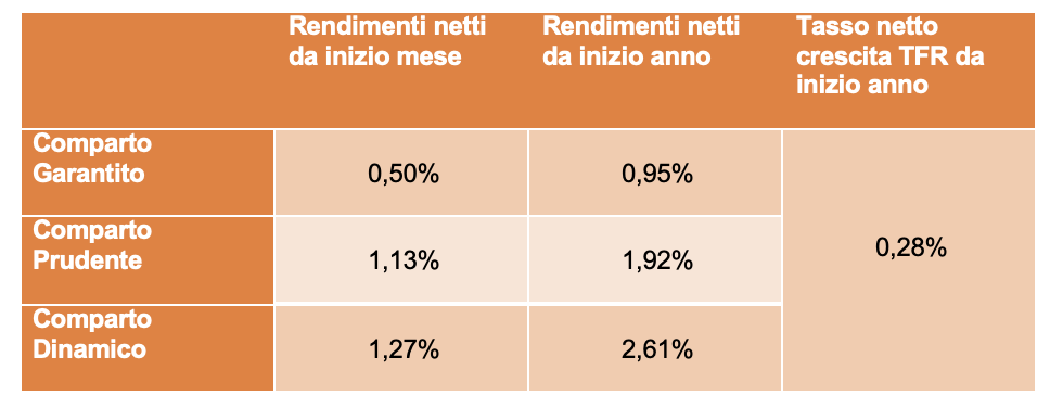 Buono anche il recupero del comparto Garantito, che ben riflette l’andamento positivo dell’asset class obbligazionaria. Il risultato mensile è del +0,63% ed è superiore a quello del TFR lordo (+0,34%), mentre da inizio anno la performance si consolida ulteriormente (+1,21%) distaccandosi in maniera significativa rispetto al parametro di riferimento (+0,46%).